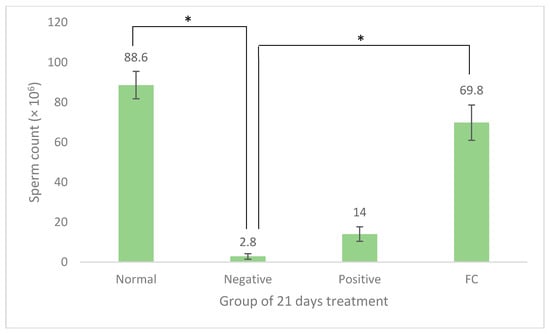 Sperm count (× 106) of rats from normal (normal group with distilled water), negative (diabetic group with distilled water), positive (diabetic group with 300 mg/kg metformin), and FC (diabetic group with 400 mg/kg Ficus carica aqueous extract). Symbol “*” represents significant difference (p < 0.05).