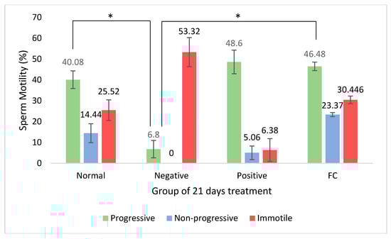 Sperm motility (%) of rats from normal (normal group with distilled water), negative (diabetic group with distilled water), positive (diabetic group with 300 mg/kg metformin), and FC (diabetic group with 400 mg/kg Ficus carica aqueous extract). Symbol “*” represents significant difference (p < 0.05).