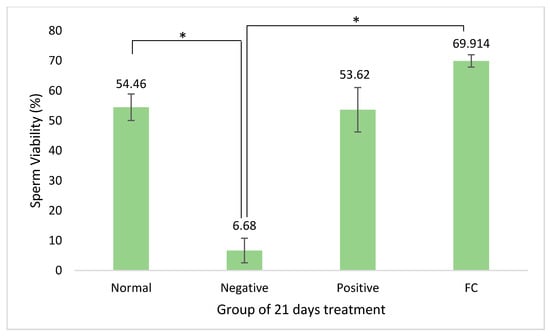 Sperm viability (%) of rats from normal (normal group with distilled water), negative (diabetic group with distilled water), positive (diabetic group with 300 mg/kg metformin), and FC (diabetic group with 400 mg/kg Ficus carica aqueous extract). Symbol “*” represents significant difference (p < 0.05).