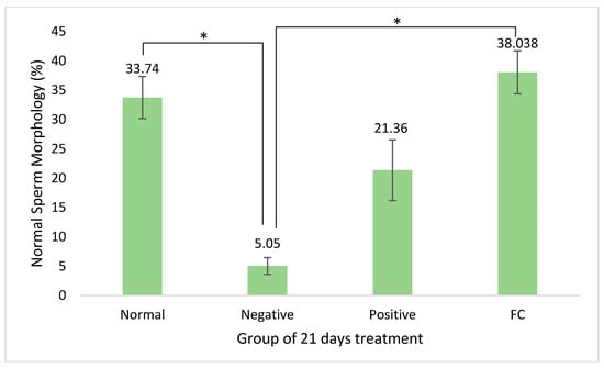Normal sperm morphology (%) of rats from normal (normal group with distilled water), negative (diabetic group with distilled water), positive (diabetic group with 300 mg/kg metformin), and FC (diabetic group with 400 mg/kg Ficus carica aqueous extract). Symbol “*” represents significant difference (p < 0.05).