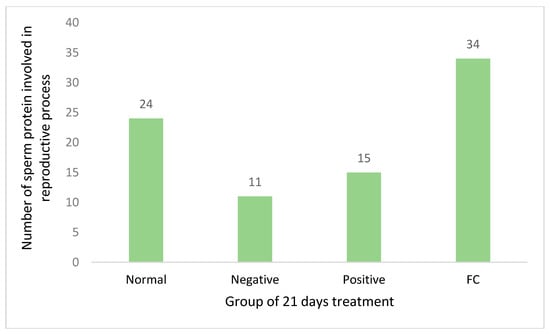 Based on gene ontology analysis via Blast2GO and WEGO, sperm proteomic analysis was focused on the reproductive process in order to evaluate the protein activity and function involved in diabetic rat fertility, as shown in Figure 7 and Figure S1. Expression of reproductive protein in normal control was 24 proteins, negative control was 11 proteins, positive control was 15 proteins, and FC group with the highest number of 34 proteins.