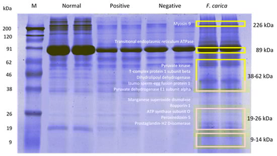 Based on the Uniprot database, approximately 32.3% of total sperm proteins in the FC treated group have been identified on fertility-related function and activity. Table 3 shows a total of 14 unique fertility proteins in FC group (negative control did not have these proteins) were identified along with their fertility-related function and molecular weight. The proteins were then classified into two groups according to their functions in the fertility of diabetic rat. The two groups of proteins were protective unique protein (manganese superoxide dismutase, peroxiredoxin-5, endoplasmic reticulum stress regulator ATPase, pyruvate kinase, ATP synthase subunit O and pyruvate dehydrogenase E1 component subunit alpha) and reproductive unique protein (myosin-9, prostaglandin-H2 D-isomerase, histone H2B, dynein light chain 1, ropporin-1, T-complex protein 1 subunit beta, dihydrolipoyl dehydrogenase, and Izumo sperm-egg fusion protein 1). The classification of reproductive unique protein was based on the functions of spermatogenesis and fertilization, as shown in Table 3. The unique protein molecular weight data was then matched back to the FC group protein bands in SDS-PAGE gel to show the distribution of this fertility protein according to molecular weight (Figure 8).