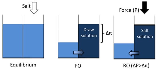 Forward osmosis is the movement of water through a semi-permeable membrane due to an osmotic pressure gradient []. In the FO process, a semi-permeable membrane separates two solutions with different concentrations. The concentrated solution is called “draw” and the diluted solution “feed”, referring to the nature of the process in which the high-salinity solution “draws” the water from the low-salinity solution, which “feeds” water to the process []. The osmotic pressure difference between the two solutions is the driving force that causes water to migrate from the feed side to the draw side [,,,,]. In contrast, for RO a hydrostatic pressure greater than the osmotic pressure is applied to the draw side, causing water to flow from the concentrated side to the more diluted side. Figure 1 is a schematic depiction of the FO and RO processes.
