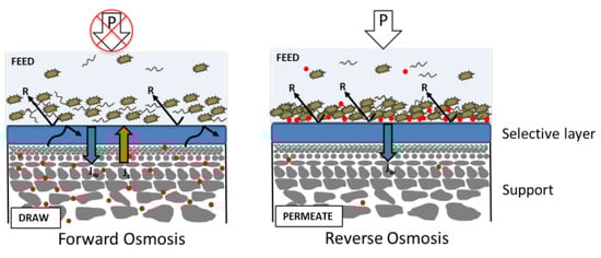 FO typically offers higher rejection of a broad range of contaminants compared to RO processes, due to its retarded forward diffusion of the ionic species from the draw solute [] (see also Figure 3). One study looked at the possibility of removing foulants from coal seam gas by FO and found that the dissolved organic carbon, denosine tri-phosphate and major inorganic scalants (Ca, Mg and silica) in the coal seam gas feed were removed substantially []. Moreover, FO showed almost 7.5 times higher rejection of urea as compared to the RO rejections []. In another study [], FO was investigated as a potential process for rejection of micropollutants; a higher rejection of bisphenol A in FO mode (99.5 ± 0.1%) than in the RO mode (97.3 ± 1.6%) were obtained.