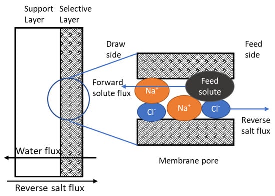 Schematic of the reverse flux of the draw solutes retarding forward diffusion of feed solutes in the FO process; after Xie et al. [].