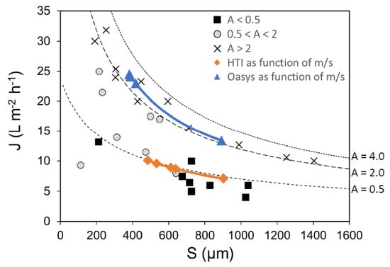 Correlation between determined the S parameter and forward osmosis flux for different A (L m−2 h−1 bar−1) values. The data from hollow fiber membranes gathered from literature ([,,,,,,,,,,,,,,,,]) for FO mode with 1 M NaCl as a draw solution. Data from the HTI and Oasys membranes for 1 M NaCl at different crossflow velocities (extracted from []). The dotted lines represent the theoretically expected fluxes for membrane permeances of 4.0, 2.0, and 0.5 (L m−2 h−1 bar−1) respectively based on their S parameter.