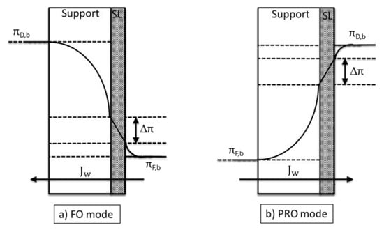 Thus, in FO mode (SL-FS orientation), the porous support layer prevents good mixing of the draw solution and the permeate in the membrane support, slowing down the mass transfer rate. As a result, less draw solute reaches the selective layer which causes a decrease in the driving force []. This is referred to as dilutive ICP because it occurs in the support. On the feed side, the water flow pushes solute from the feed solution towards the surface of the selective layer, which results in concentrative ECP (Figure 6a).