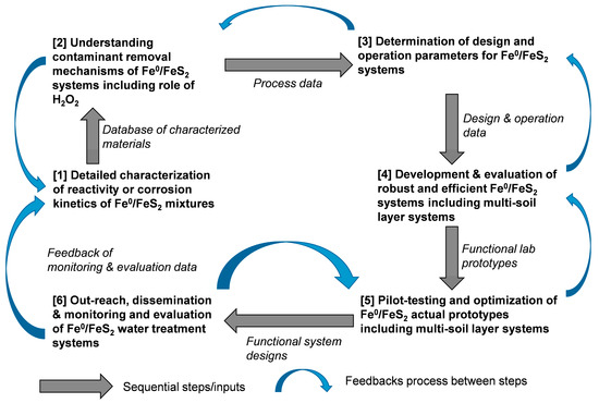 A systematic approach is required in the coming years to better understand the operating mode of Fe0/FeS2/H2O systems. Figure 2 presents a conceptual summary of the focal areas of future research critical for the development of Fe0/FeS2/H2O-based water treatment systems. Figure 2 also shows the key inputs/outputs of each step, including feedbacks between the various steps, indicating the iterative nature of the design process. Specifically, future research on Fe0/FeS2/H2O systems should include: (i) characterization of the long-term Fe0 and FeS2 reactivities, (ii) determination of the design and operation principles of Fe0/FeS2/H2O systems; (iii) laboratory developments and evaluations of functional prototypes of Fe0/FeS2/H2O systems, including multi-soil layer systems; (iv) pilot-scale and field testing and evaluation of actual Fe0/FeS2/H2O systems; and (v) outreach and dissemination of the Fe0/FeS2/H2O systems, including monitoring and evaluation by potential end-users of the technology.