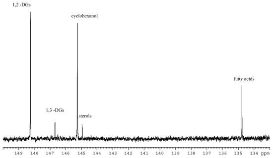 - Fronimaki, P.; Spyros, A.; Christophoridou, S.; Dais, P. Determination of the diglyceride content in Greek virgin olive oils and some commercial olive oils by employing 31P NMR spectroscopy. J. Agric. Food Chem. 2002, 50, 2207–2213. [Google Scholar] [CrossRef] [PubMed]