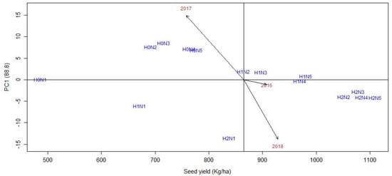 The AMMI model indicated complex YTI, which makes graphical interpretation of modules difficult, so it is essential to use alternative procedures to interpret YTI, such as AMMI parameters [38]. The proposed modified AMMI stability index (MASI) considers all significant IPCAs to rank treatments on the basis of stability [39]. MASI was calculated for seed yield using output from the AMMI model, and the results are presented in Table 7. Treatment H0N1, followed by H1N4 and H1N5, had low MASI values, and hence were identified as more stable. Treatments H2N5, followed by H2N4 and H2N3, had very high seed yield. Considering the stability of treatments and their mean seed yield together (SSI), treatment H1N4 and H1N5 had high stability and high seed yield followed by treatment H2N3, as indicated by their low SSI values.