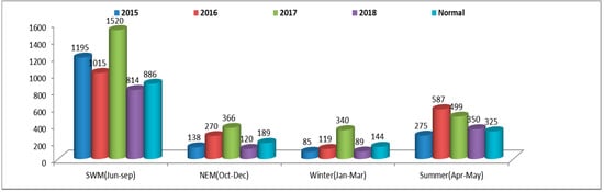 Rainfall during the cropping seasons from 2015–2018 with normal rainfall of Manipur. SWM—South West Monsoon; NEM—North East Monsoon.