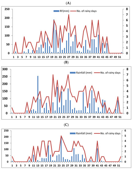 Rainfall (RF) distribution during (A) 2016, (B) 2017, and (C) 2018 in Manipur in standard weeks.