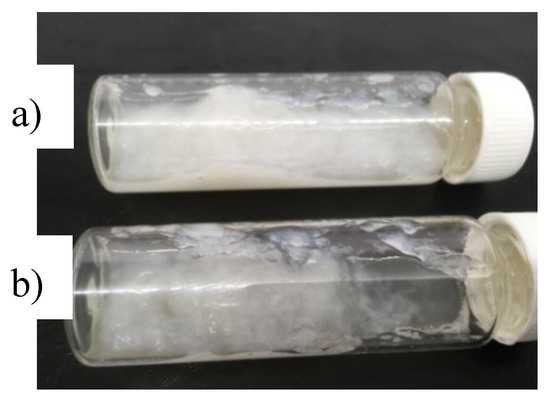 Appearance of the neat dispersion containing 0.5% of bacterial cellulose BC (a) and the same dispersion after sonication (b).