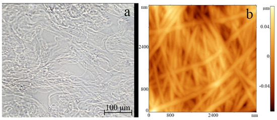 In order to examine the morphology of the BC, a MultiMode IIIa atomic force microscope (AFM) (Bruker Corporation, Santa Barbara, CA, USA) and polarizing microscopy Boetius (VEB Kombinat Nadema GmbH, Ruhla, former DDR) at ambient conditions were used. The AFM measurements were performed in a contact mode using silicon nitride cantilevers with 8 nm tip radius of NP series (Bruker Corporation, Santa Barbara, CA, USA) with the force constant of 0.12 N/m. To obtain AFM images of the bacterial cellulose, films were prepared from neat gels by drying under room conditions to an equilibrium moisture content. The dried film was stick to metal disc. Image processing using FemtoScan001 SPM image software (Center for Advanced Technologies, Moscow, Russia, 2012) was performed.