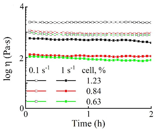 With increasing temperature, the nature of the flow did not change: viscosity decreased with shear rate almost linearly. Based on the data presented in Figure 11a, the dependence of log η on 103/T was constructed. The character of obtained dependence was linear, which suggests that the temperature dependence of viscosity can be described by the Arrhenius equation. There was no significant changes of dispersion structure in the temperature range studied.
