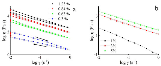 The corresponding data for NCC dispersions are shown in Figure 5. Comparison with rheological behavior of BC dispersions says about very similar character of non-Newtonian behavior without realization of the initial Newtonian viscosity and two main distinctions. The first concerns much lower viscosity values for NCC dispersions. For almost equally concentrated dispersions: 1% in the case of NCC and 1.23% in the case of BC, the difference of viscosities at low shear rates reaches 2–2.5 orders in favor of BC. The second distinction consists in absence for NCC dispersions of thixotropic behavior, i.e., flow curves in modes of increase and decrease of shear rate coincides almost completely.