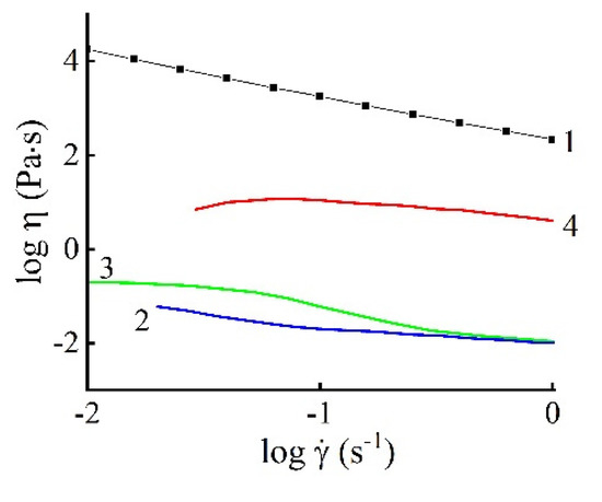 Flow curves of 1% wt. aqueous suspension of various particular celluloses: BC of this study—1, cellulose whiskers—2 [40], NCC—3 [38] and mixture of MCC and Na-carboxymethylcellulose—4 [36].