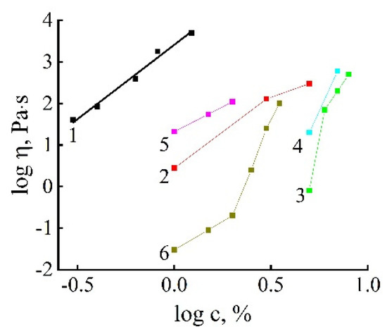 Concentration dependence of viscosity for different cellulose dispersions at 25 °C and γ = 0.1 s−1: BC—1, NCC (acidic hydrolysis)—2, NCC—3 [33], NCC—4 [38], MCC—5 [35], cellulose whiskers—6 [40].