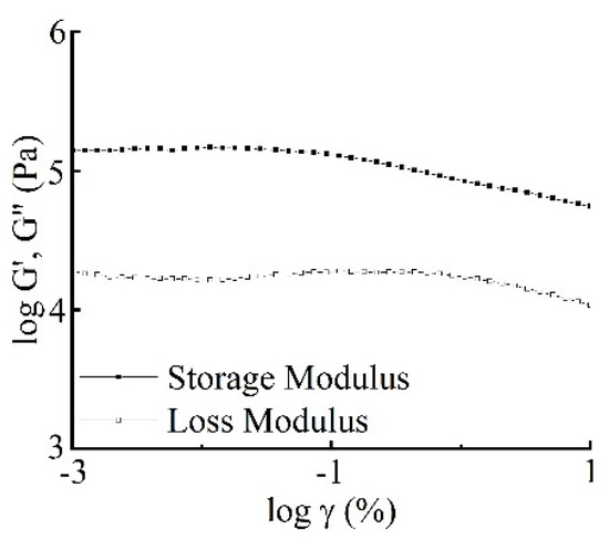 In the oscillatory mode of deformation, one important task is a determination of the linear domain of viscoelasticity where the measured moduli are independent on the applied strain. Figure 9 represents evolution of the storage and loss moduli of the BC dispersion containing 1.23%, on the amplitude of deformation at a fixed frequency of 1 Hz.