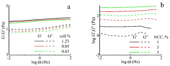 Dependences of elastic and loss moduli on oscillation frequency at strain of 0.01% for dispersions containing 0.63%, 0.84% and 1.23% of BC (a) and for dispersion with 1.0%, 3.0% and 5.0% of NCC (b) at 25 °C.