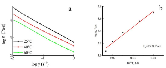 Flow curves of 1.23% BC aqueous dispersion at different temperatures (a) and dependence of viscosity measured at γ = 0.1 s−1 on reciprocal temperature (b).