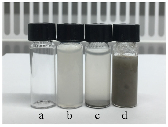 Photos (from left to right): an empty glass container (a), aqueous 0.5% BC dispersion (b), 0.5% aqueous dispersion of nanodiamonds (c) and mixed aqueous dispersion of 0.5% BC + 0.5% nanodiamonds (d).