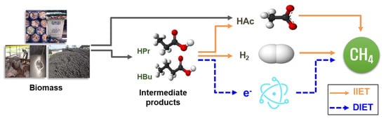 Anaerobic digestion (AD) is a traditional biological process utilized for treating various organic wastes including wastewater and complex solid wastes. Via AD, organic matters are converted to biogas, rich in methane (CH4), while nutrients-rich residues suitable for high-quality compost are generated as byproduct [1,2,3]. AD process consists of up to four consecutive steps, i.e., hydrolysis, acidogenesis, acetogenesis, and methanogenesis, in which the rate-limiting step can be different depending on the type of treated feedstock [4]. However, the syntrophic acetogenesis was often considered as a bottleneck that is highly governing the whole rate of AD process [5,6]. Syntrophic acetogens convert C2–C6 organic acids/alcohols to electron donors of low-molecular weight, mainly H2 and acetic acid, which would be consumed by methanogens. This is a well-known indirect interspecies electron transfer (IIET) route, and many attempts were made to enhance this reaction. In particular, the importance of keeping low H2 partial pressure for acquiring stable IIET was addressed in many studies [7,8,9]. However, a new route, transferring electrons directly between acetogens or acidogens to methanogens, called direct interspecies electron transfer (DIET), was recently introduced (Figure 1).