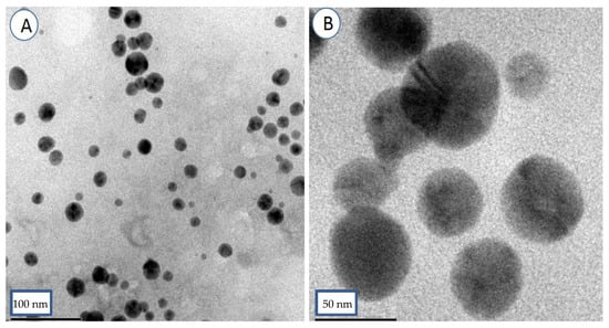 (A) and (B) transmission electron microscope (TEM) images of AgNPs manufactured from Asian spider flower (Asf)-leaves, showing different particle size.
