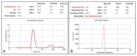 Dynamic light scattering (DLS) profile. (A) Size distribution of Asf-AgNPs (Asian spider flower-Silver nanoparticles) with maximum intensity at 19.59 nm, (B) Stable Asf-AgNPs at −8.30 Mv in zeta potential analysis.