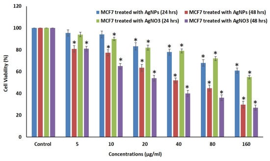 Inhibitory outcome of AgNO3 and AgNPs manufactured from leaves extract of Asf on MCF7 cells at 24 and 48 hrs. Values are given as mean ± S.D. for each concentration. *Indicates the treated concentrations statistically significant (p < 0.05) when compared to control.