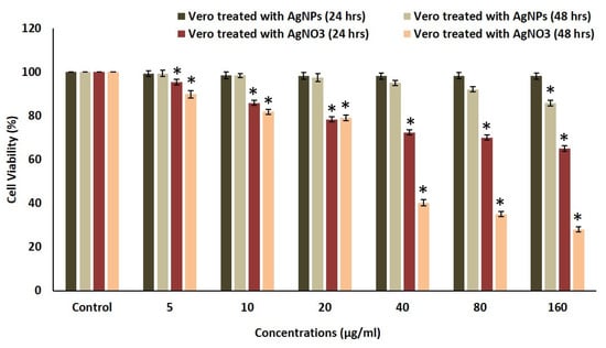 Effect of AgNO3 and Asf-AgNPs on normal Vero cells at 24 and 48 hrs. Values are given as mean ± S.D. for each concentration. *Indicates the treated concentrations statistically significant (p < 0.05) when compared to control.