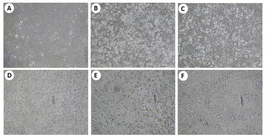 Effect of AgNO3 and Asf-AgNPs on cell morphology of MCF7 and Vero cell line at 48 h. (A) Control (Vero), (B) AgNO3 treated on Vero (40 μg/mL), (C) Asf-AgNPs treated on Vero (40 μg/mL), (D) Control (MCF7), (E) AgNO3 treated on MCF7 (40 μg/mL), (F) Asf-AgNPs treated on MCF7 (IC50 – 40 μg/mL).