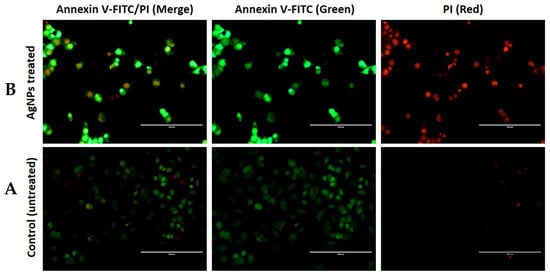 Apoptotic cells were determined with a dual staining method following the manufacturer’s protocol []. Cells (1 × 106/well) were cultured in 6-well plates and allowed to attach overnight with Asf-AgNPs (40 µg/mL) The IC50 concentrations also observed with the overnight treatment. Control cells were also maintained independently for 48 h. These cells were then collected, washed twice with PBS, and resuspended in 1x binding buffer (500 µL). Cells were then stained with annexin V-FITC conjugate (5 µL) and propidium iodide (PI) solution (10 µL) in dark at 30 °C for 15 min. Using a fluorescent microscope (EVOS® FLoid® Cell Imaging Station), stained cells were analyzed to determine the cell viability (with annexin V-FITC and PI negative) and also to detect the early apoptosis (with annexin V-FITC positive and PI negative), or late apoptosis (with annexin V-FITC and PI positive). The % of annexin V positive cells was used to quantify the degree of apoptosis after treatments.