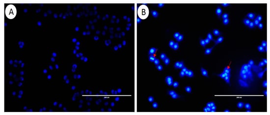DAPI (4′,6-diamidino-2-phenylindole) pictures of MCF7 cells. Control cells (A), Cells treated with Asf-AgNPs. (B). Red arrows designate apoptotic cells.