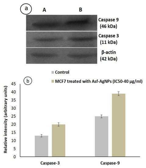 The maintenance of homeostasis through the regulation of cell death and inflammation is governed by a family of caspases. Caspase stimulation is generally considered to be an important marker of apoptosis led by several apoptotic mediators []. Among them, cysteine proteases serve as primary mediators of apoptosis. In the mammalian system, apoptotic caspase-3 is not an initiator caspase but acts an executioner which leads to the degradation of cellular components for apoptosis. In general it has three functional groups: caspases 3, 8, and 9. Involuntary cell death is commenced by the stimulation of caspase cascade (caspases 3, 6, and 9) followed by the capture of G2/M phase in the cell cycle []. Caspase-3 is an important killer of apoptosis. Its active form is vital for flouting cellular modules associated with DNA overhaul and regulation. Caspase-3 has also been used in numerous circumstances such as for anticancer drug handling []. In this work, MCF7 cells treated with Asf-AgNPs triggered apoptosis showing an up-regulation on the active forms of caspases 3 and 9 (Figure 12). MCF7 cells treated with Asf-AgNPs showed enhanced expression levels of caspases-3 and 9 compared to MCF7 cells without Asf-AgNPs. Β-actin was used as an internal control. The statistical significance in the in the over expression of apoptotic protein was observed in the treatments (MCF7 treated with Asf-AgNPs (IC50 at 40 µg/mL) when compared with the control at p value < 0.05. Manikandan et al. [] have reported that Solanum trilobatum extract can decide the AgNPs-influenced ROS generation and trigger the inherent apoptotic pathway. Modulation of anti-apoptotic (Bax and Bcl-2) and apoptotic (caspase-3 and 9) protein countenance in mitochondria can affect cell death through a caspase-dependent pathway. Previous reports have revealed that AgNPs have shown acceptable potential anticancer activities [,,,] in human cancer.