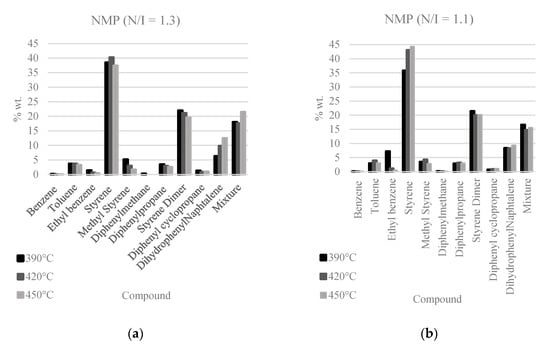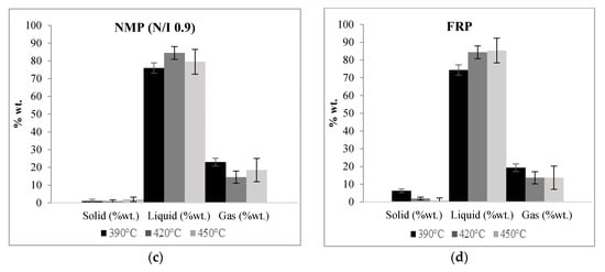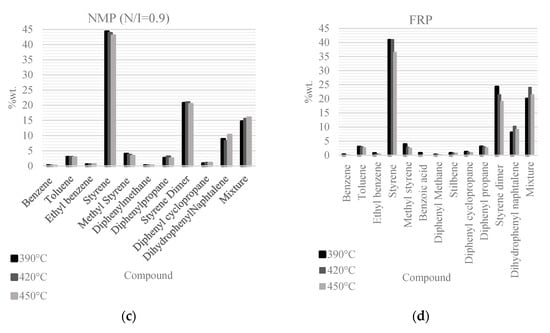 Figure 4 shows the identified products of the PS pyrolysis in the liquid fraction; their relative amounts are plotted for each PS pyrolysis experiment at three reaction temperatures (390, 420, and 450 °C). The main product in all cases is styrene followed by styrene dimer in second place; an extra category is included denoted as “mixture”, which corresponds to the sum of all the components that could not be identified, but individually amount to less than 1 wt.%. In the case of the FRP samples, stilbene and benzoic acid are also generated and the compounds in the non-identified mixture reach the highest values of all the samples.