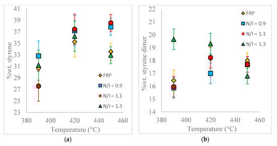 Figure 5 shows the absolute yields of styrene monomer and styrene dimer of the different samples (with respect to the total load of PS, not only with respect to the liquid fraction recovered), indicating that at higher reaction temperatures the styrene dimer concentration tends to lower for the reaction with N/I = 1.3, but it is the opposite for the reaction with N/I = 0.9. The monomer recovery yield exhibits a more complex behavior with temperature. For samples N/I = 1.1 and N/I = 0.9, the monomer recovery yield increases with higher temperatures, while for the N/I = 1.3 and the FRP samples maxima for monomer yield are exhibited. Clearly, not all the effects observed are significant, but in some cases the differences are evident, although generally moderate.