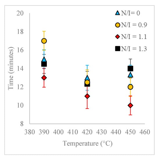 Pyrolysis reaction time is also affected by the use of PS samples containing nitroxide. Compared with FRP PS, the pyrolysis of these samples results in shorter reaction times at comparable temperatures, except in the case of FRP PS at 450 °C (