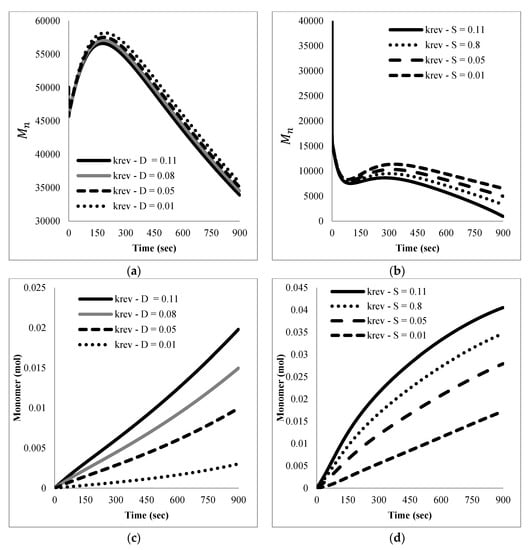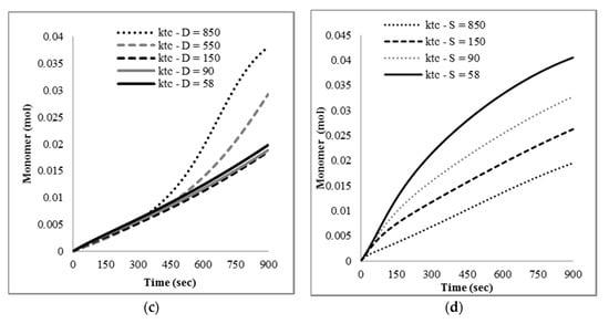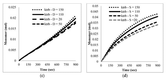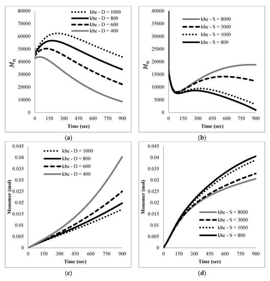 Literature values for the kinetic constants were tested using the mathematical model in terms of moments described by the Equations (5)–(8) and (13)–(24); however, the sets of parameter values available in the literature were either incomplete or corresponded to kinetic models with differences with respect to the one proposed here. When they were tried in the present kinetic model, they yielded inconsistent results in the sense of high stiffness and/or non-convergence of the numerical integration of the differential equations, as well as some results without proper physical meaning.