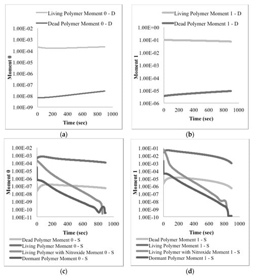 The method of moments applied to the previously described balance equations generates Equations (13)–(15) for the zero-th, first, and second moments of dead polymer, respectively, Equations (16)–(18) for the moments of dormant polymer, Equations (19)–(21) for polymeric radical moments, and Equations (22)–(24) for the moments of polymeric radicals with a nitroxide end functionality.