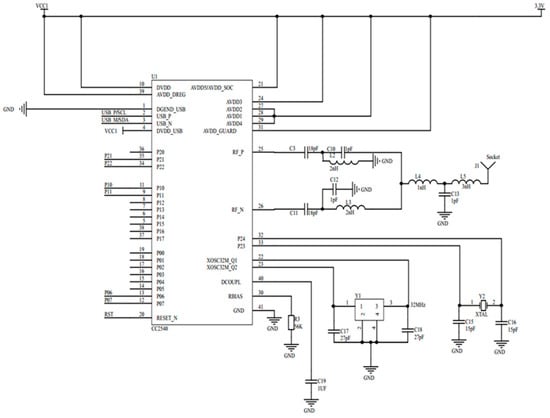 BLE4.0 is a wireless communication method widely used in embedded devices, so this paper chose the chip CC2540 that supports BLE4.0 as the MCU of the device. Figure 3 shows the MCU and wireless communication circuitry of the device. The infusion monitor device needs to receive the data sent by the host computer while transmitting the signal detected by itself to the upper computer, so the control of the system and the realization of the wireless communication are all required. The CC2540 is a wireless RF micro-controller that can communicate wirelessly with the host computer via the BLE4.0 communication protocol and the onboard inverted-F antenna [] while completing system control. The PIN10 on the CC2540 is used to control the on and off of the BJT current to achieve LED illumination control to reduce power consumption. The PIN07 converts the analog voltage signal output from the infrared photodiode circuit into a digital signal through the ADC. The antenna section contains a balun circuit [] to ensure that the inverted F antenna operates in a better state.