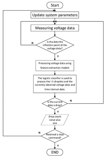 Logistic classifiers have been widely used in cancer gene selection [], landslide susceptibility analysis [,], children’s sitting posture classification [], and underwater cylindrical object detection [], and its stability and superiority have been fully confirmed. On the premise of improving the accuracy of monitoring and counting, the hardware circuit is simplified. The circuit design without an operational amplifier reduces the cost of the circuit and the power consumption of the equipment. Since this detection method needs to store some voltage waveform information and time information, in order to reduce the complexity of the operation and improve the detection efficiency, this paper adds the data dimensionality reduction model before the design of the logistics classifier and adjusts the model parameters of data dimension reduction when training the logistics classifier to achieve more accurate detection. At the same time, in order to obtain the data of the training model and provide the communication interface for information management in practical application, this paper uses the chip supporting BLE4.0 communication control to realize communication and device control at the same time. The experimental results show that this method can improve the detection accuracy of liquid drop and reduce the requirements of hardware equipment, which is conducive to the large-scale development of intelligent infusion equipment in the future.