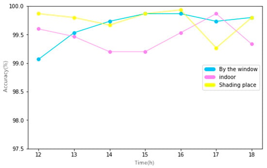In the actual collection in this paper, there are 2682 data from the shady place, 3010 data from indoor, and 2611 data from by the window. When stratified sampling was conducted, 70% of the sampled data is used for training and 30% for actual testing. After training, the recall rate measured on the training set was 100%, and the accuracy rate measured on the test set was also 100%. When applied to the actual Bluetooth device, this value decreased slightly. The data records of the test are shown in Table 1, and the change in accuracy is shown in Figure 9. The conclusion is that the infusion detector has high accuracy in three environments and, at each time, is easily derived.