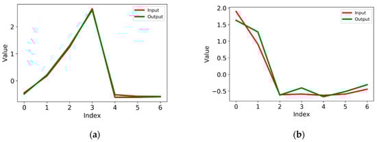 After the test set was constructed, two sets of test data were randomly selected in the test set. The test results are shown in Figure 10a,b, where red is the input data (original data) and green is the generalization of the basic expression algorithm of the results of the two graphs after reconstruction.