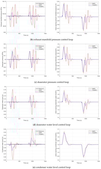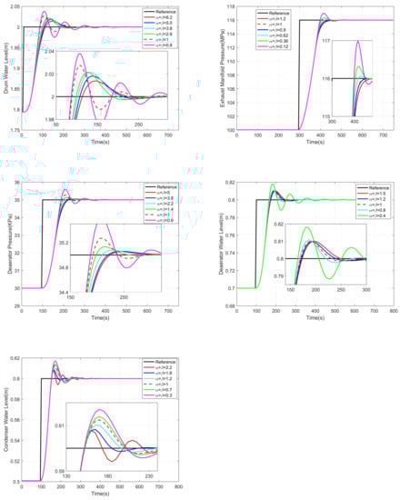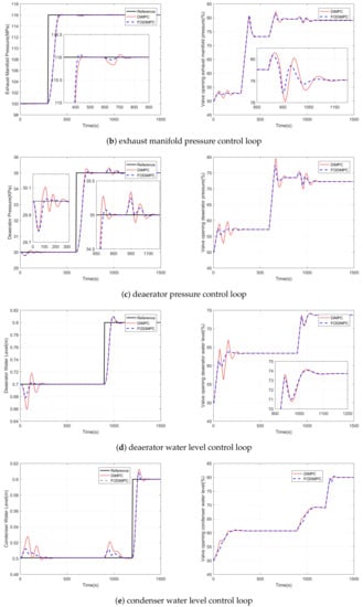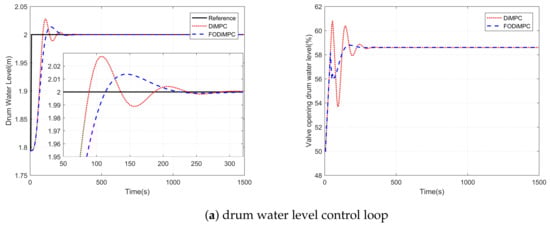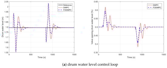 The combined index J for the reference tracking case is 1.1711. Both from the Figure 3 and performance indexes, it can be concluded that the FOMPC outperforms the MPC in reference tracking experiment. The response time and overshoot are both smaller in FOMPC than those in the traditional MPC. From Table 5, the s for sub-loop 5 are similar, however, the s are much different from each other. This is caused by the interaction between water levels of deaerator and condenser water level. The condenser has a smaller volume than the deaerator, hence, the water level in condenser changes a lot along with the deaerator water level.