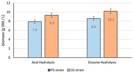 Hydrolysates prepared by thermo-acidic or enzymatic treatment were enriched with mineral salts and used for the cultivation of Pichia stipitis LOCK 0049 (PS) and C. guilliermondii ATCC 6260 (CG) at 35 °C for 48 h. The biomass content after cultivation is presented in Figure 1.