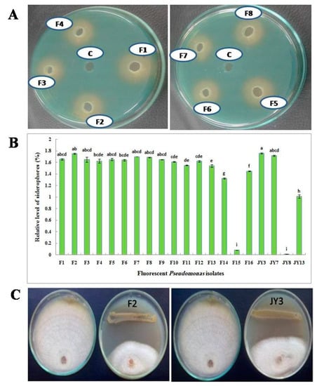(A) Qualitative assay of siderophore production on chrome azurol S (CAS) agar plates using supernatant of some fluorescent Pseudomonas isolates; (B) Relative level of siderophores produced by fluorescent Pseudomonas isolates grown on succinic medium using CAS assay and (C) antagonistic effect of Pseudomonas aeruginosa F2 and Pseudomonas fluorescens JY3 against Fusarium solani, plate on the left in each photo is the corresponding control without the antagonist (data are presented in Table 2).