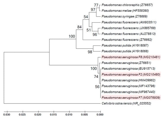 Pseudomonas isolates F2, F7 and F8, which produced a higher percentage of siderophore production than the other Pseudomonas isolates isolated in the current study, were identified based on sequencing of 16S rRNA gene. A database search to identify the bacterial isolates was achieved in BLAST search at the National Center for Biotechnology Information site (http://www.ncbi.nlm.nih.gov). Blast results revealed that sequences of isolates F2, F7 and F8 were almost similar to several P. aeruginosa strains with homology percentage of 99%. Pseudomonas isolates F2, F7 and F8 were identified as P. aeruginosa with accession numbers of MG210480, MG076939 and MG210481, respectively (Table 1). A phylogenetic tree of the 16S rRNA gene that was generated using the nucleotide sequences of the fluorescent Pseudomonas isolates F2, F7 and F8 (obtained in the current investigation) and other pseudomonad 16S rRNA gene sequences (obtained from GenBank database) revealed that two major clusters exist. Cluster 1 included Cellvibrio ostraviensis, while all fluorescent Pseudomonas isolates obtained in this study and provided from GenBank database were clustered in cluster 2. This cluster is divided into two groups: the first group included P. aeruginosa F2, F7 and F8 with the other P. aeruginosa strains provided from GenBank; while the second group contained P. fluorescens, P. putida, P. chlororaphis, P. syringae and P. meliae (Figure 2).