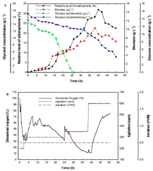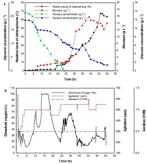 (A) Relative level of siderophores, biomass, glucose concentration and glycerol concentration as a function of time for batch fermentation culture broth of Pseudomonas aeruginosa F2 and (B) dissolved oxygen, agitation and aeration as a function of time during batch fermentation of Pseudomonas aeruginosa F2.