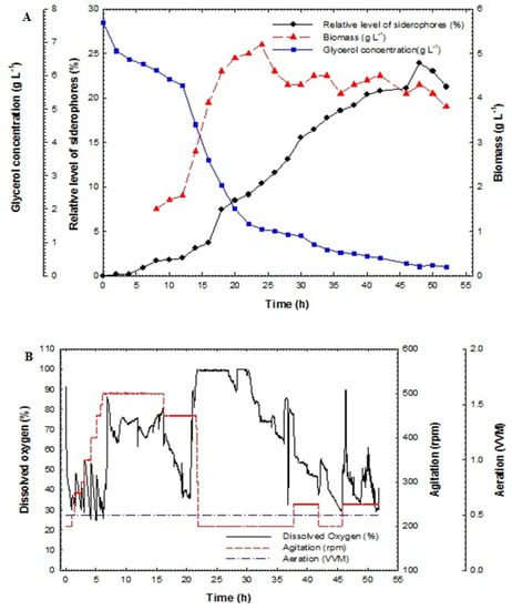 Batch fermentation technique in the bioreactor was used in this study to enhance siderophores production from P. aeruginosa F2 and P. fluorescens JY3 compared to cultivation in shake flasks, which produced a low relative level of siderophores in our previous study. Batch fermentation was performed using P. aeruginosa F2 and P. fluorescens JY3 in a 10-L bench-top bioreactor (Cleaver, Saratoga, CA, USA), where both isolates produced a higher percentage of siderophores production than the other Pseudomonas isolates that were screened in the current work. Figure 3A shows the relative level of siderophores, cell biomass, glucose and glycerol concentrations of the culture broth of P. aeruginosa F2 plotted against time. Cell biomass of P. aeruginosa F2 increased slowly during lag phase, which continued for 5 h. After that, the culture entered exponential phase (log phase) where the biomass increased rapidly with a constant specific growth rate, µ of 0.043 h−1. The dissolved oxygen decreased as a result of the increasing demand for O2 that is required for bacterial growth (Figure 3B). To assure sufficient oxygen provided, oxygen was maintained at over 30% by increasing the agitation rate. After 41 h the dissolved oxygen was increased gradually until the end of the run. The maximum biomass achieved was 10.3 g L−1 at 38 h. Relative level of siderophores reached 1.91% at 12 h but it accomplished its maximum value of 31.9% at 40 h. Glycerol concentration decreased slowly and it was not fully consumed as its value reached 4.5 g L−1 at 50 h but glucose concentration decreased rapidly and it was fully consumed at 26 h. Relative level of siderophores, biomass and glycerol concentration in the culture broth of P. fluorescens JY3 against time are shown in Figure 4A, where relative level of siderophores achieved was 1.97% at 12 h, reaching its maximum value of 23.9% at 48 h. Moreover, the maximum biomass achieved was 5.2 g L−1 at 24 h and glycerol concentration decreased gradually to reach 0.25 g L−1 at 52 h. P. fluorescens JY3 cell biomass increased exponentially with specific growth rate, µ of 0.096 h−1. The dissolved oxygen decreased rapidly and reached 30% in the first hour, so that, motor speed was increased and accordingly agitation rate increased until 6 h, consequently, dissolved oxygen increased rapidly as a result of increasing agitation speed (Figure 4B).